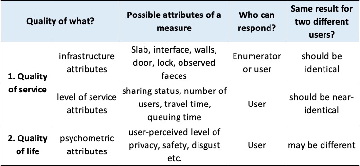 In summary, measures of quality of life (QoL) focus on subjective user-perceived outcomes (e.g. how safe the user feels). By contrast, measures of quality of service (QoS) focus on infrastructure attributes (e.g. presence of an inside lock) or level of service attributes (e.g. number of households sharing). Both QoS and QoL measures provide useful information and can be complementary, but it is important to be clear on whose perspective they provide, to inform their intended purpose (Table 1).