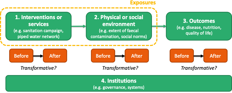 2. I also tend to think about transformation in terms of outcomes, as opposed to interventions or environmental contamination (Figure 1). By outcomes I mean not only infectious disease and nutrition, but also quality of life, because users value WASH services for many reasons.