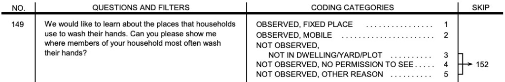 How the question is asked and coded in the latest DHS household questionnaire is below. Key aspects of the question are: (i) if there are multiple places, it’s the one used “most often”, and no specific critical time (after using the toilet, before preparing food) is referred to; (ii) the most-used HWF must be observed – if no handwashing facility is observed or it is off-plot, the household is counted as having “no HWF at home”. If the household does not give permission, or it is not possible to observe for other reasons, it is counted as ‘no permission to see/other’ in survey reports and is excluded from the denominator for JMP service ladders. The DHS interviewer’s manual (p.46) recommends probing to observe mobile HWFs.