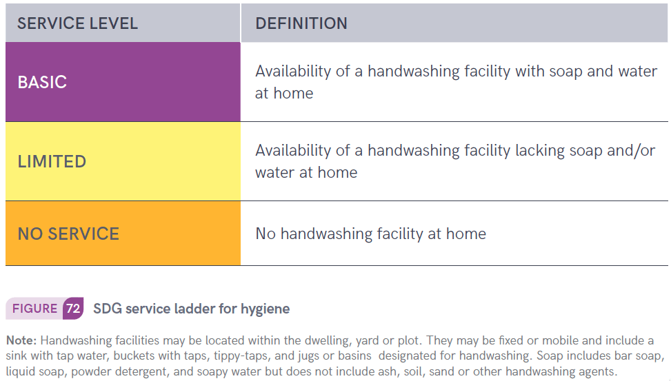 The SDG6 hygiene indicator is the % of people with access to a basic HWF. “Basic” is defined according to the below figure from the JMP 2021 report for households: “availability of a handwashing facility with soap and water at home”. Of greater importance for this post is the note below the figure, which emphasises that HWFs may be (i) located within the dwelling, yard or plot; (ii) fixed or mobile.